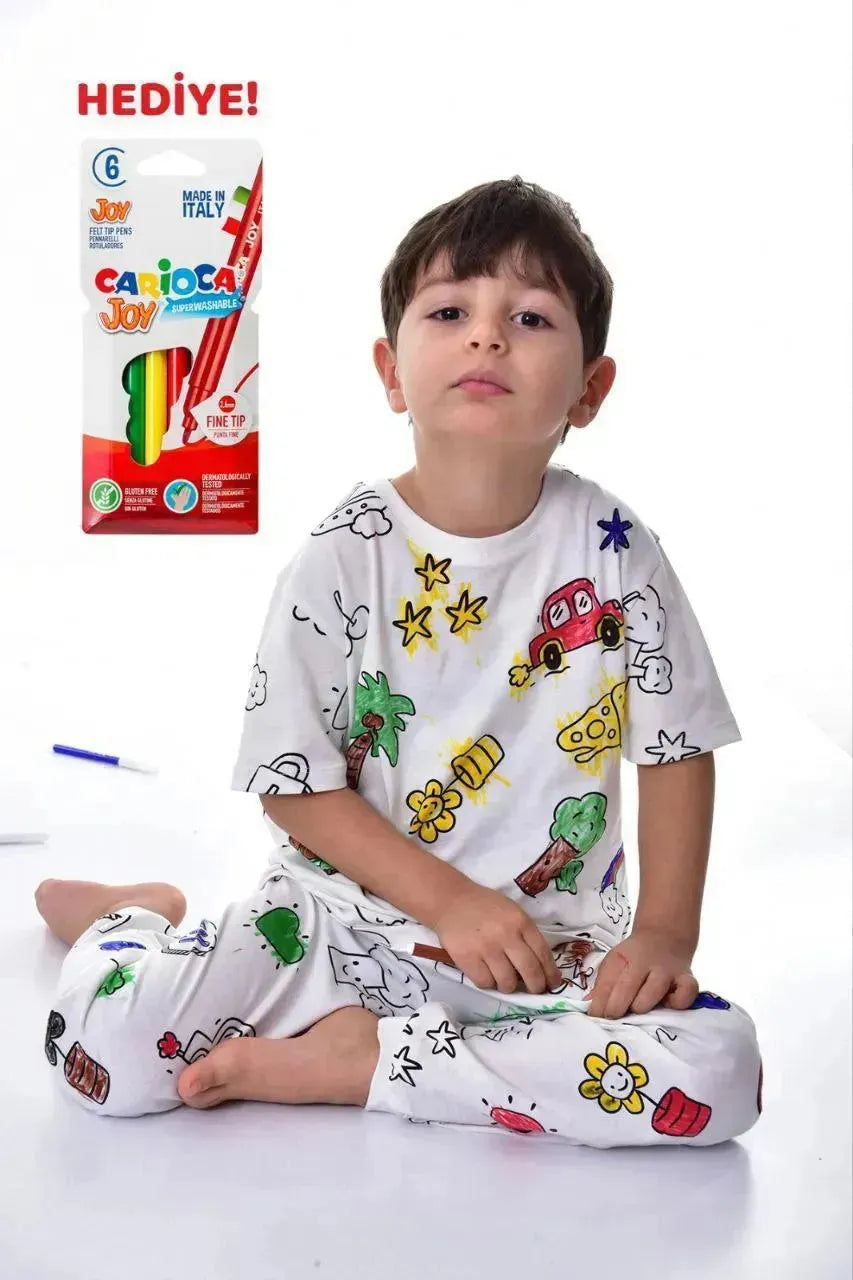 طقم مميز فريد من نوعه للأطفال المبدعين! مصنوع من قطن ناعم عالي الجودة بنسبة 100% لضمان الراحة القصوى، يحول وقت اللعب إلى تجربة فنية ممتعة!